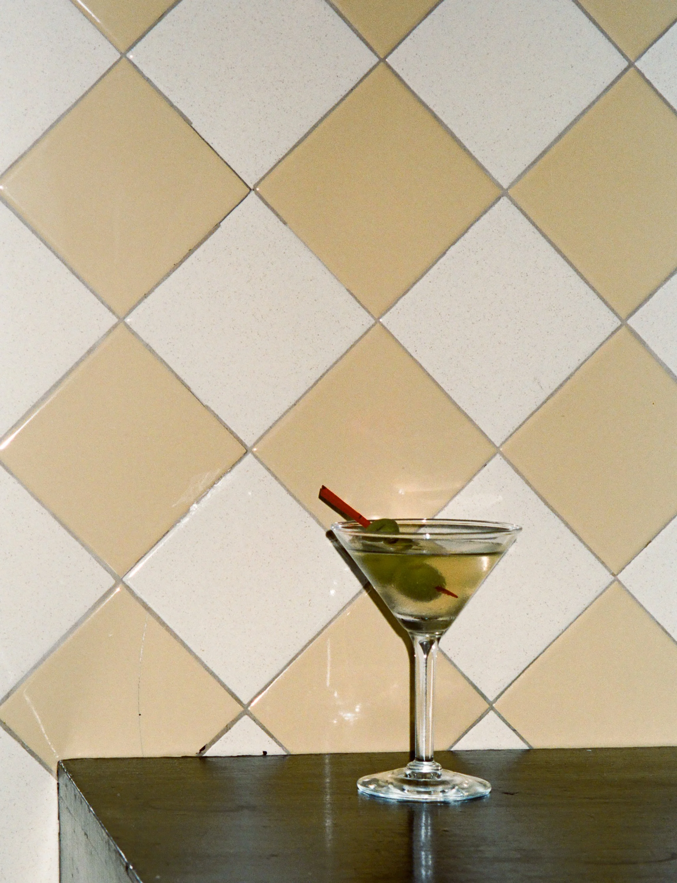 Martini glass with green olives and a cherry, placed on a dark table against a beige and white tiled wall.
